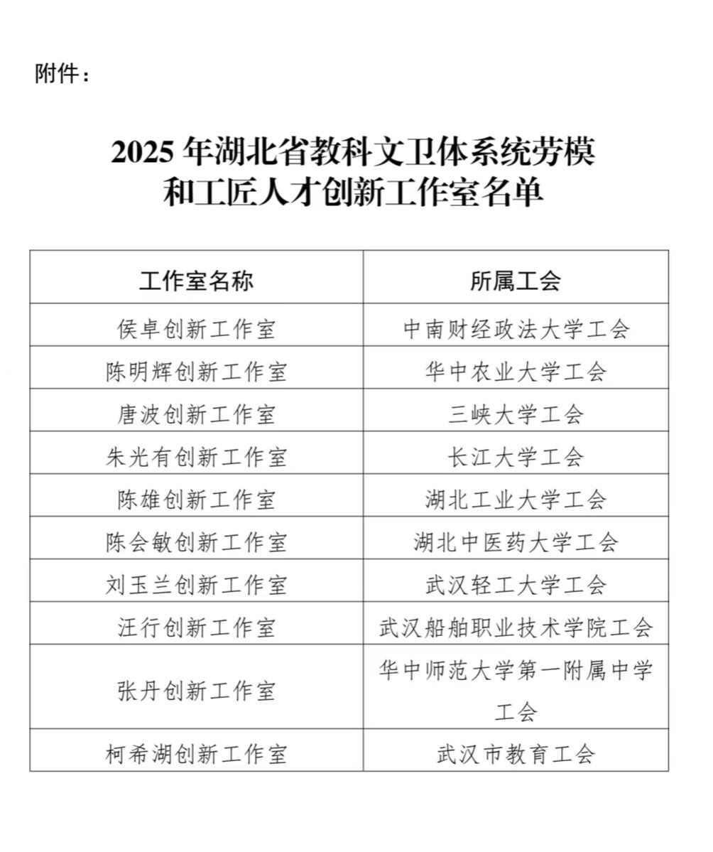 2025年7月,湖北省教科文卫体工会印发《关于建设湖北省教科文卫体工会劳模和工匠人才创新工作室的通知》,明确2025年华中农业大学等10家单位各建设1个系统劳模和工匠人才创新工作室。经省教科文卫体工会形式审查、实地查看、网上公示,我院教师陈明辉及其创新工作室获评省教科文卫体系统劳模和工匠人才创新工作室。